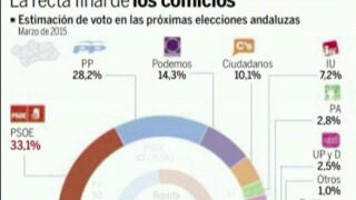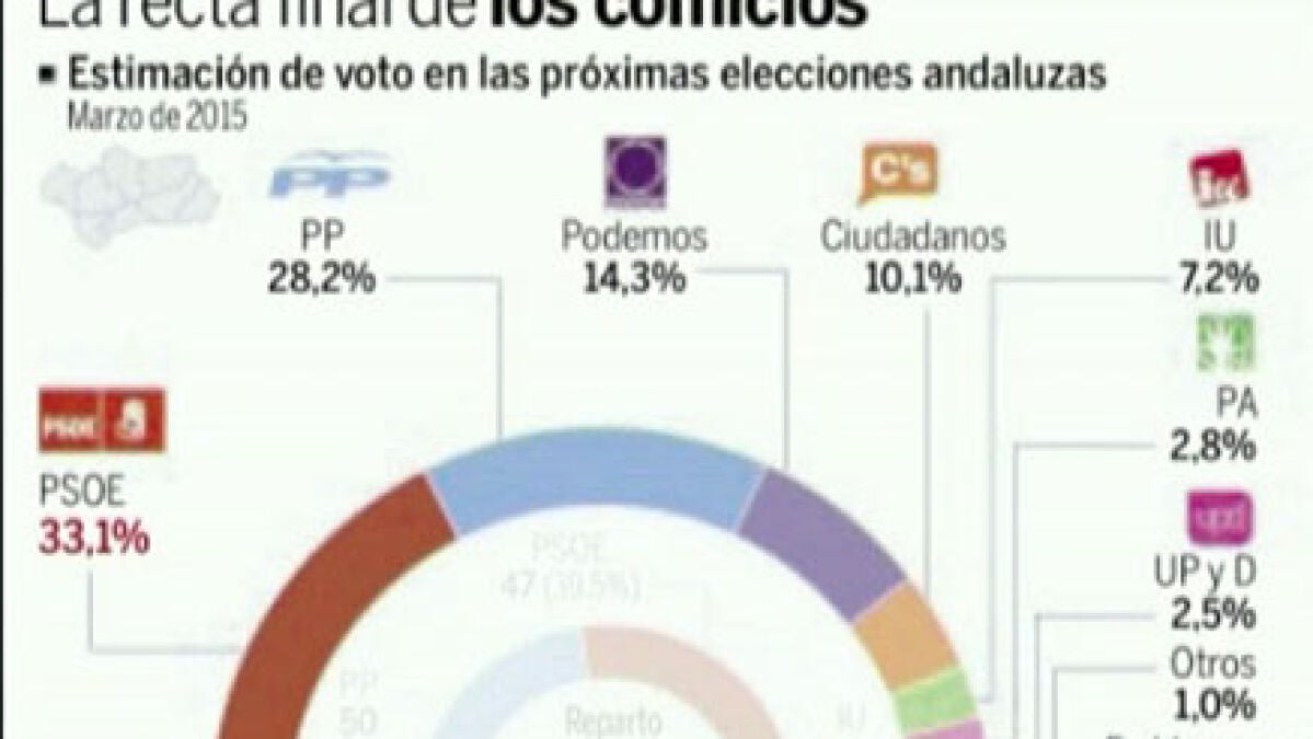El sondeo señala que el PSOE es la formación más votada, aunque su líder, Susana Díaz, bajaría respecto a los últimos comicios regionales y se quedaría, con entre 44 y 46 escaños, lejos de la mayoría absoluta que está en los 55 diputados. La estimación del voto en esta encuesta para las principales formaciones es la siguiente: PSOE, 33,1 %; PP, 28,2 %; Podemos, 14,3 %; Ciudadanos, 10,1 %; e IU, 7,2 %.