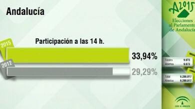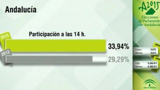 La participación en las elecciones en Andalucía a las 18:00 horas es del 51,43%, cuatro puntos más que en 2012 a estas horas, según datos de la Junta. De las ocho circunscripciones Sevilla con un 54,82% y Jaén con un 54,20% han sido las que han registrado un mayor índice de participación y Huelva en donde menos se ha movilizado el electorado con un 46,82%. Los datos definitivos se conocerán pasadas las 20:00 horas, media hora más tarde de lo previsto, por el retraso sufrido en uno de los colegios electorales en la provincia de Sevilla.