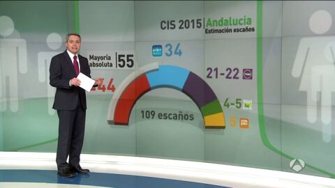 El PSOE ganaría las elecciones andaluzas y obtendría 44 escaños, 10 más que el PP, pero 11 menos de los necesarios para lograr la mayoría absoluta, según la encuesta del Centro de Investigaciones Sociológicas (CIS) previa a las elecciones del 22 de marzo. El barómetro del CIS, realizado entre el 30 de enero y el 17 de febrero a partir de 3.130 entrevistas, vaticina que los socialistas pierdan tres escaños respecto a las elecciones de 2012, pero que se beneficien del hundimiento del PP, que pasaría de 50 a 34 diputados.