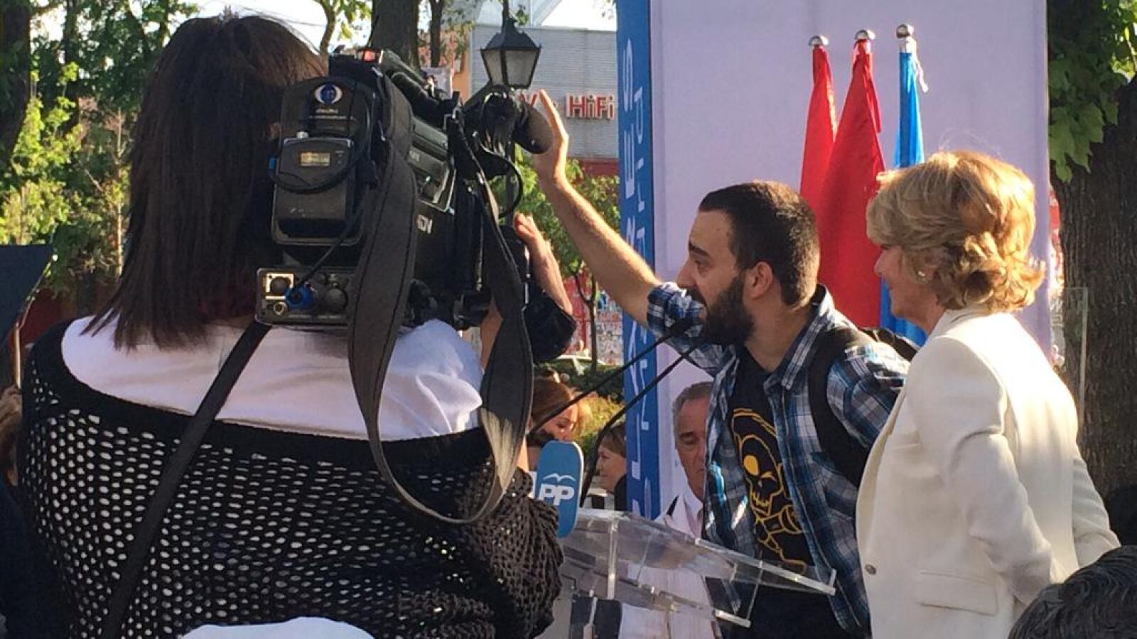 Varias decenas de manifestantes de Stop Desahucios Villaverde interrumpieron el mitin de precampaña que estaban dando Esperanza Aguirre y Cristina Cifuentes, quienes les invitaron a subir al átril y expresar sus quejas. Dos jóvenes accedieron y tomaron el micrófono.