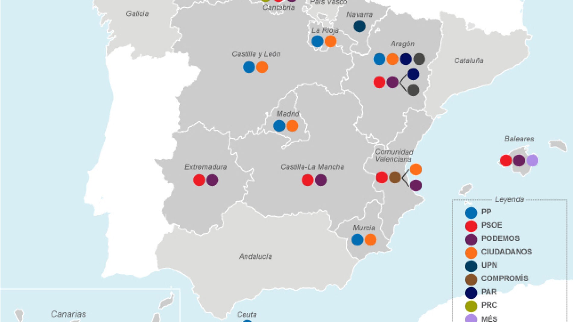 Castilla y León, Madrid, la Rioja, Murcia y Melilla podrán obtar un pacto entre PP y Ciudadanos para formar gobierno. Comunidades como Comunidad de Valenciana, Aragón o Baleares necesitarán al menos una coalición de tres partidos para alcanzar la mayoría absoluta. Cospedal pierde la hegemonía en Castilla-La Mancha.