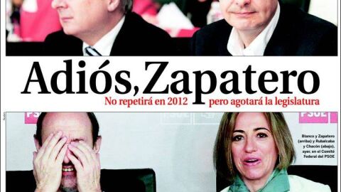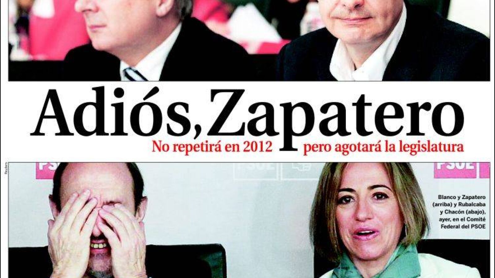 ABC apela a sus lectores con el titular: "Elecciones ya. Zapatero no será candidato, pero pretende continuar en Moncloa hasta el último día. Propone unas primarias para que el 1 de septiembre esté elegido su sucesor". La imagen es para el todavía presidente del Gobierno, sonriente encabezando la mesa del Comité Federal en el que anunció su retirada. PÚBLICO recoge en su primera: "Zapatero deja paso"; "Defiende las primarias, pide 'integración' y avisa de que ejercerá como presidente 'hasta el último día'"; "La era Zapatero, una llegada y un adiós prematuros"; "Los posible sucesores. Rubalcaba y Chacón, dos generaciones en busca de un nuevo liderazgo".