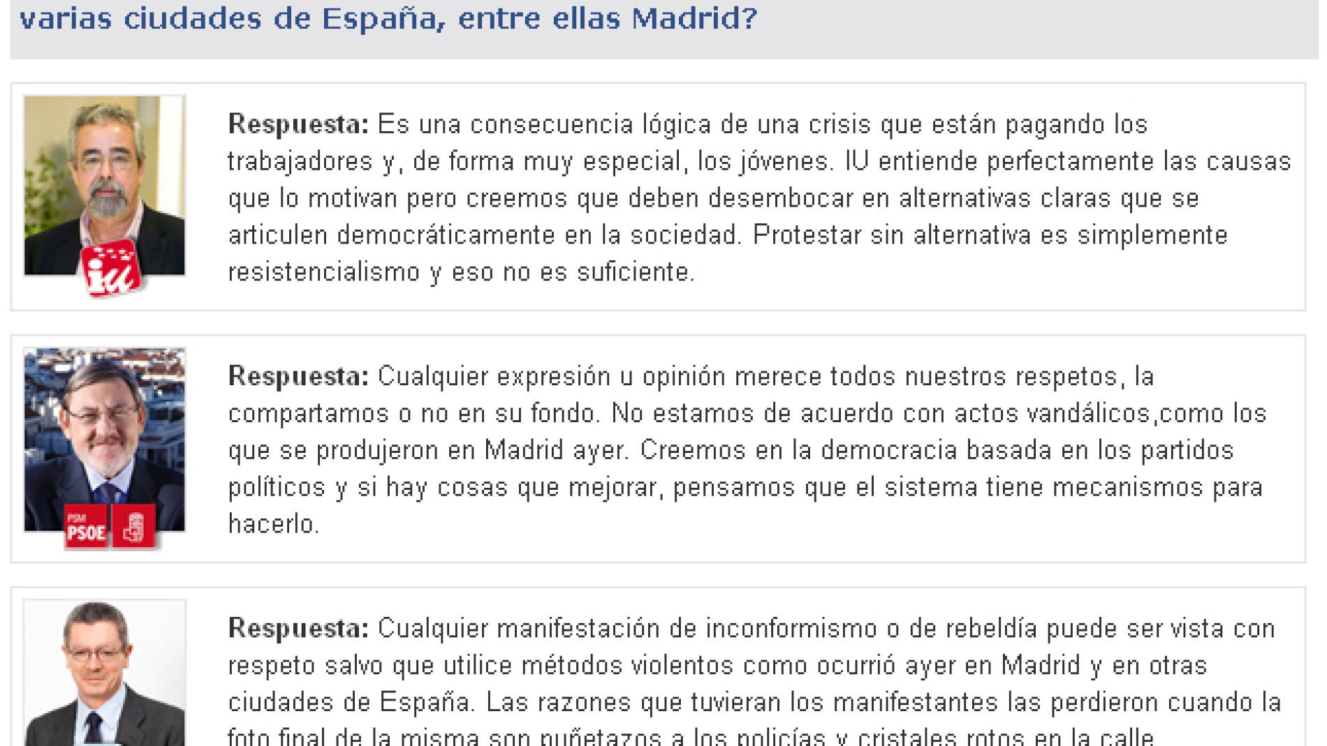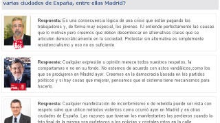 Preguntados sobre este tema en el debate 2.0 organizado por Europa Press, los tres candidatos han mantenido un discurso en la misma línea. Así, para Pérez las manifestaciones son "una consecuencia lógica de una crisis que están pagando los trabajadores y, de forma muy especial, los jóvenes".