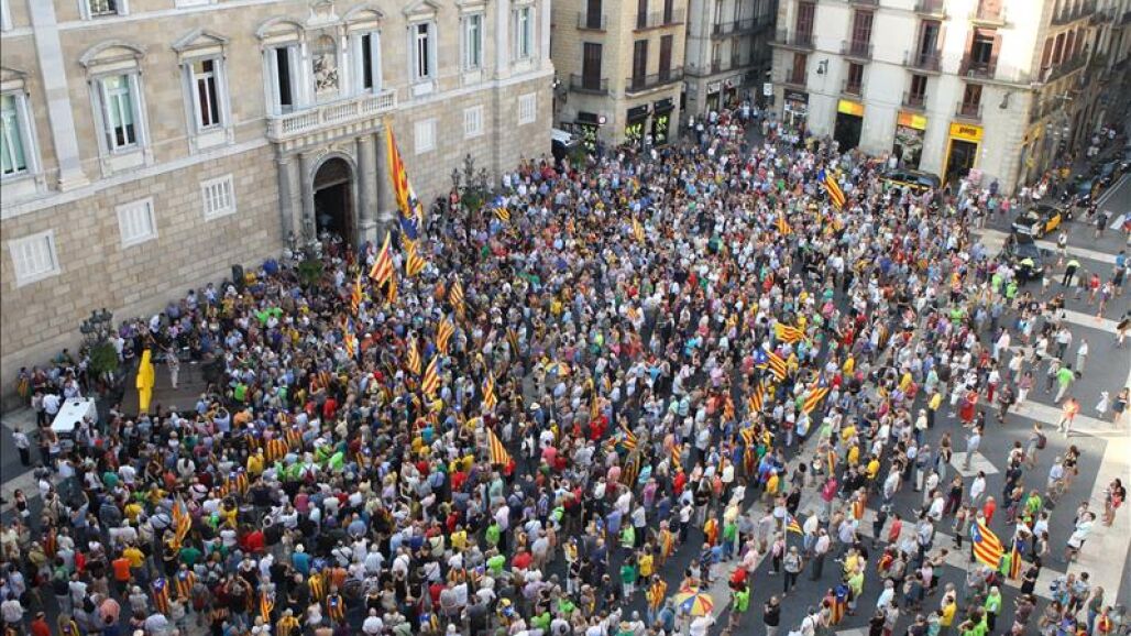 Alrededor de un millar de personas se han concentrado este martes en la plaza Sant Jaume de Barcelona, ante el Palau de la Generalitat, en apoyo del carácter plebiscitario de los comicios catalanes del 27 de septiembre y de la Diada del 11S.