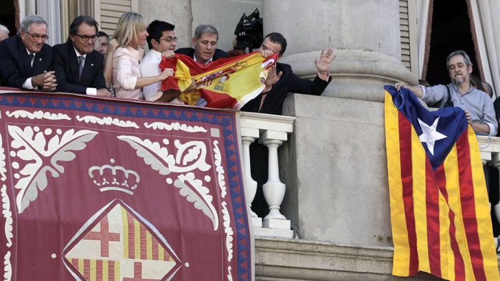En un gesto inédito, el concejal de ERC Alfred Bosch ha colgado una bandera independentista. Ha pretendido que esa bandera presidiera la mayor fiesta de Barcelona. Cuando el concejal del PP Alberto Fernández Díaz, se ha percatado, ha intentado hacer lo mismo pero con una bandera de España y con menos fortuna porque, Gerardo Pisarelo, el teniente de alcalde, con camisa blanca, ha tratado de impedírselo. Y todo esto, con Artur Mas contemplando la escena y a 3 días de las elecciones en Cataluña.