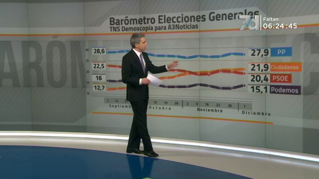 Antena 3 Noticias les viene ofreciendo, desde hace ya varios meses, el barómetro semanal de TNS Demoscopia. Según los resultados de esta última entrega, el Partido Popular ganaría las elecciones con un 27,9%. Ciudadanos ocuparía la segunda posición con el 21,9%. El PSOE sería tercero, con el 20,4%. Y Podemos sería el cuarto partido del Congreso, con el 15,1%. Muy lejos queda Izquierda Unida con el 4,3%.