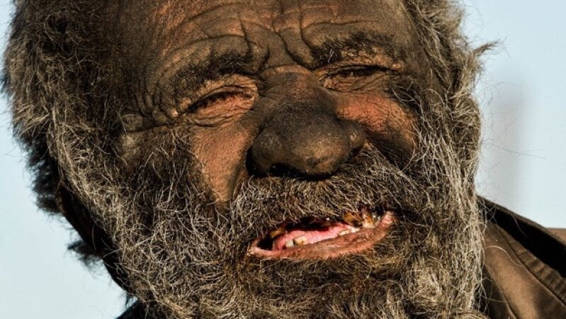 Con su barba y el rostro curtido por la roña, Amoo Hadji tiene la apariencia de un viejo ermitaño. La suciedad ha hecho callo y ahora tiene la apariencia de una segunda piel.
