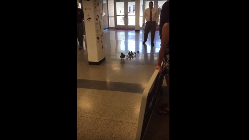 Una mamá pato atraviesa los pasillos de un instituto de Montana (Estados Unidos) al frente de sus doce patitos, para guiarles a un río situado frente al edificio del Bozeman High School. El vídeo se ha vuelto viral en las redes sociales.