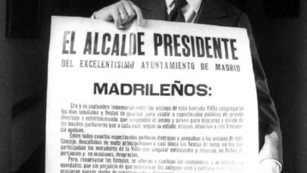 Finalmente integró su partido en el PSOE, partido en el que fue elegido presidente de honor. En sus siete años de alcalde cambió la fisonomía de Madrid, apoyó la denominada movida madrileña y destacó por sus bandos municipales, textos muy literarios con grandes dosis de humor.