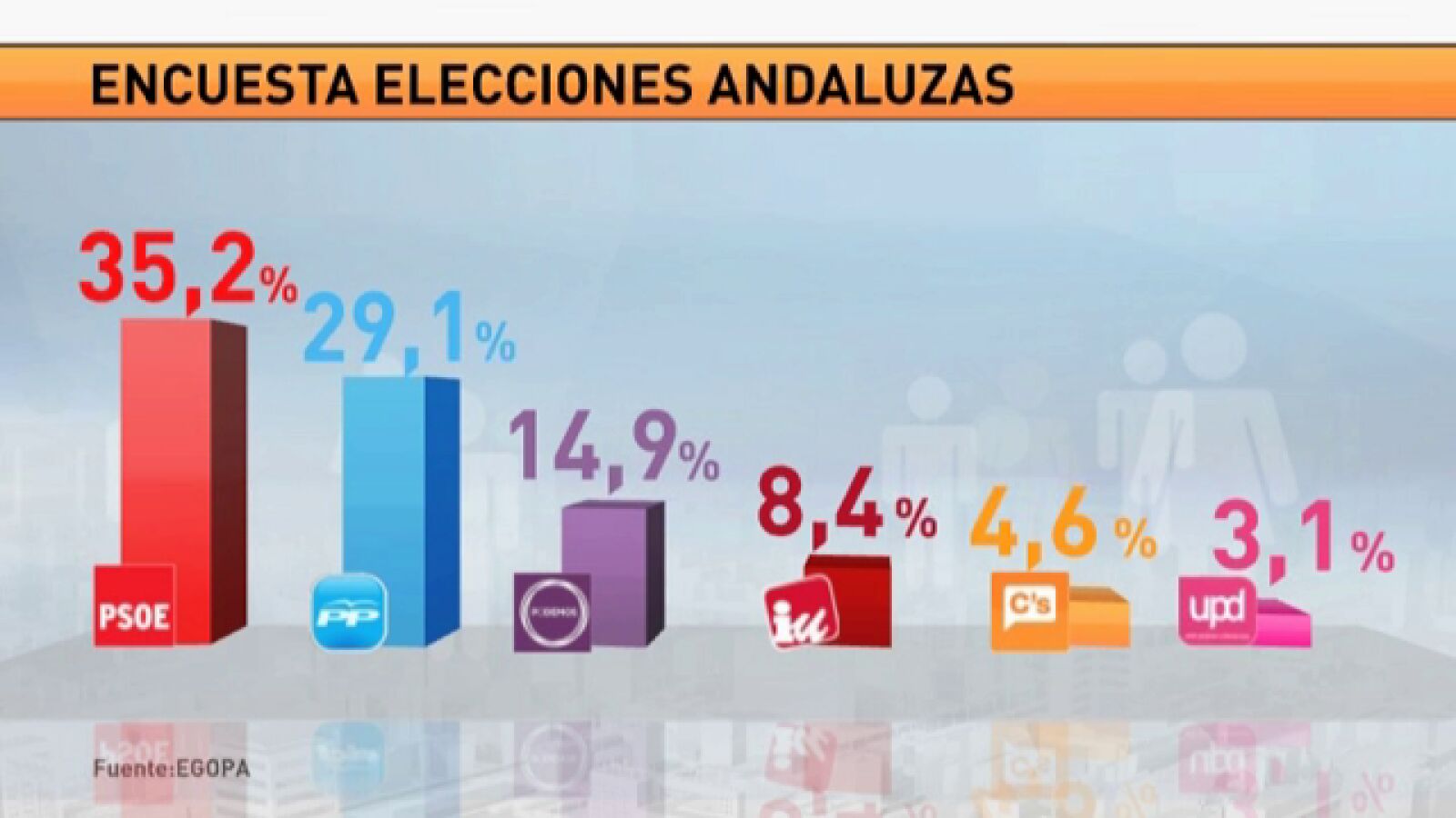 La formación de Susana Díaz obtendría el 35,2% de los votos, frente al 29,1% del PP. Podemos irrumpiría como la tercera fueza en el Palamento andaluz con el 14,9% de apoyos, según el último Estudio General de Opinión Pública de Andalucía (Egopa).