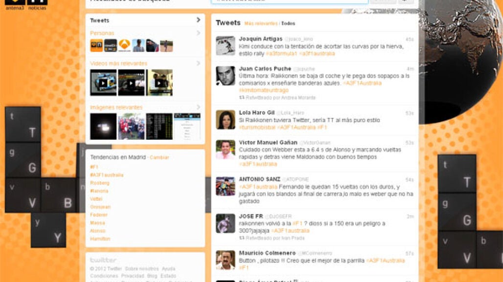 Los 'trending topic' de Twitter proclamaban a los cuatro vientos que arrancaba el primer GP de la F1. Minutos después de empezar la carrera nueve de los diez trending topic de España estaban relacionados con la competión: #F1, #A3F1Australia, #Grosjean, #Rosberg, #Los Mclaren, #Maldonado, #GP de Australia, #Vettel y #Hamilton.