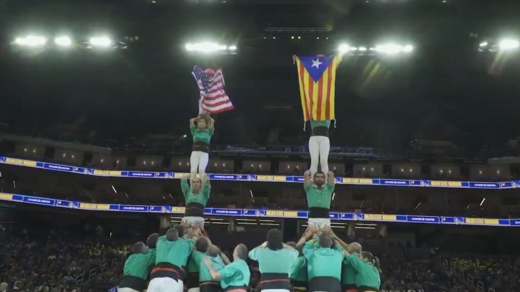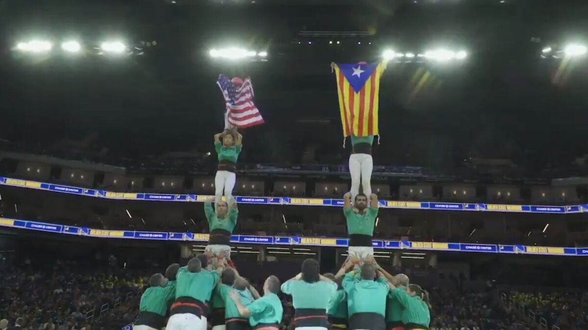 Los Castellers de Vilafranca realizaron una actuación en uno de los parones del partido entre Golden State Warriors y Timberwolves de la pretemporada de la NBA y desplegaron uan estelada junto a la bandera de EEUU.