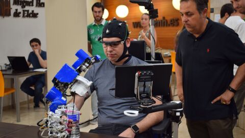 Se trata de una silla de ruedas que lleva acoplada un exoesqueleto, que es capaz de movilizar el brazo de los pacientes y ayudarles también en otras actividades diarias: apagar o encender luces y la televisión, contestar una llamada telefónica o iniciarla y realizar ejercicios de rehabilitación. El proyecto consiste en "desarrollar herramientas o estrategias" de este tipo dirigidas a "personas con diferentes discapacidades, fundamentalmente motoras y que afectan al miembro superior", según ha explicado hoy a los periodistas el coordinador del grupo de Neuroingeniería Biomédica de la UMH, Eduardo Fernández.