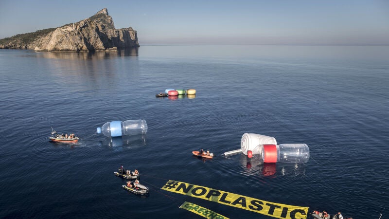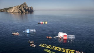 Activistas de Greenpeace han colocado este lunes 12 de junio en aguas baleares diez objetos gigantes, entre los que han destacado dos botellas de doce metros y dos vasos de seis, para visibilizar el problema de la contaminación por plásticos en los mares, y más concretamente en el Mediterráneo.