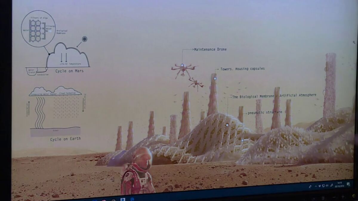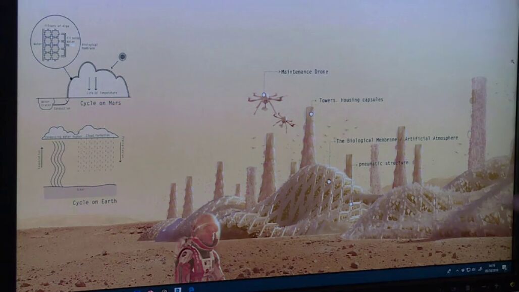 Este equipo madrileño se ha propuesto "no hacer un proyecto simplemente para colonizar otro planeta, sino que eso sirviera también para solucionar problemas reales en la Tierra". Drones especiales localizarían el mejor lugar para el asentamiento e iniciarían la construcción.