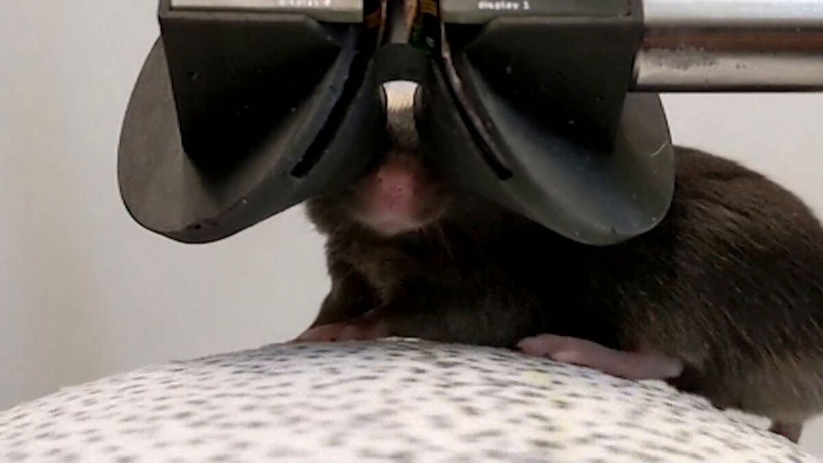 Ratones usando gafas de realidad virtual con el objetivo de investigar tratamientos contra el alzhéimer