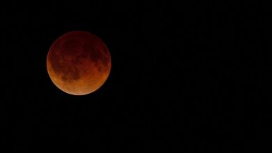La Luna se ve teñida de un "marrón rojizo". El fenómeno durará aproximadamente dos horas, hasta las 23:30 horas.