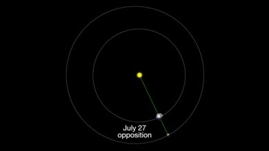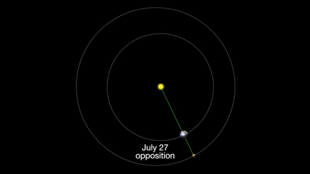 En primer lugar, Marte estará en total oposición al Sol. ¿Qué quiere decir esto? Como todos los planetas del sistema solar, Marte y la Tierra orbitan alrededor del Sol, pero a diferentes distancias y a diferentes velocidades. Cada periodo comprendido entre uno y dos años terrestres, Marte, la Tierra y el Sol se alinean durante el curso de sus órbitas, con la Tierra en el medio, un evento conocido como oposición.