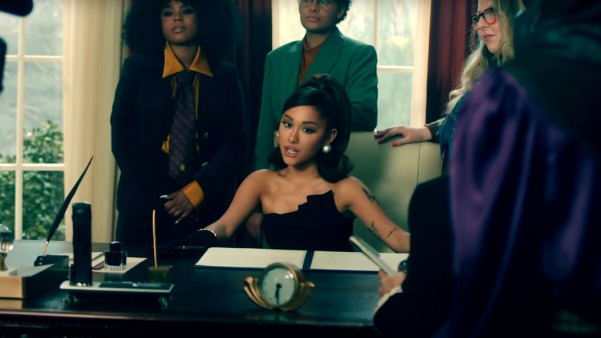 En él, Ariana Grande se mete en el papel de la primera presidenta de Estados Unidos, donde podemos verla protagonizando reuniones en el despacho oval o acompañada de un séquito de asesoras. Incluso en una de las partes del vídeo, la artista ofrece una rueda de prensa al más puro estilo presidencial, aunque también muestra otras facetas más banales, ya sea paseando a sus perros o cocinando.