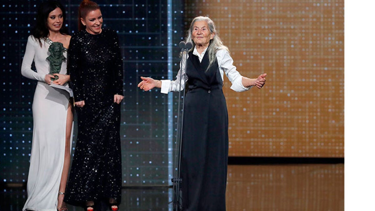 La actriz debutante con su trabajo en 'O que arde' ha subido acompañada a recoger el premio, que ha acariciado y besado. "La vida te da sorpresas y esta es una muy grande para mi larga existencia", ha señalado la actriz de 84 años.