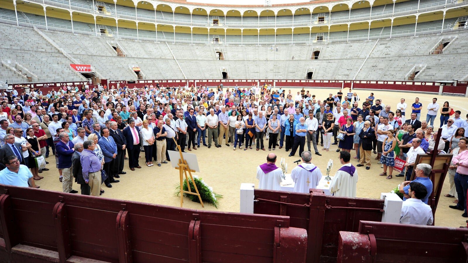 Centenares de personas, entre aficionados y profesionales, se han congregado en el ruedo de Las Ventas para recordar al matador de toros Iván Fandiño con una misa funeral en su memoria justo el día en el que se cumple un mes de su trágica muerte en la ciudad francesa de Aire Sur L'Adour. Un acto cargado de mucha emoción, en el mismo albero de la Monumental madrileña, con un improvisado altar justo debajo del tendido 1, ataviado con un capote de paseo y, junto a él, la imagen del malogrado torero de Orduña (Vizcaya) y la de la Virgen de la Paloma, patrona popular de los madrileños.