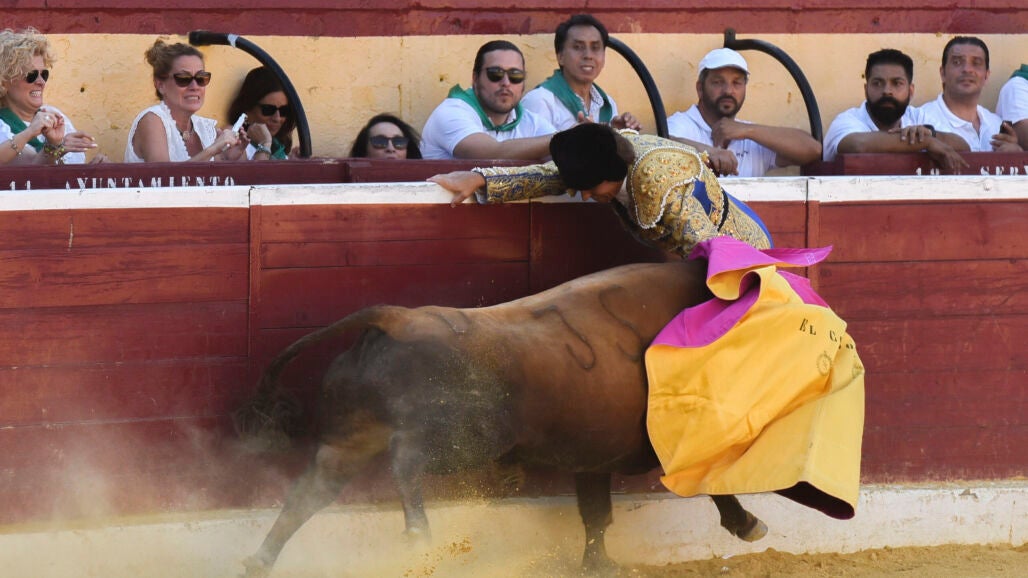 Manuel Díaz, 'El Cordobés', de 55 años, sufrió este sábado una terrible cogida cuando se disponía a torear al toro durante las Fiestas de San Lorenzo. Pegado al burladero, un castaño de Salvador Domecq le ha cogió al pleno, levantándolo por los aires, dejando unos momentos de angustia en la plaza.