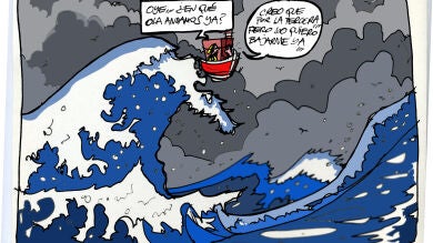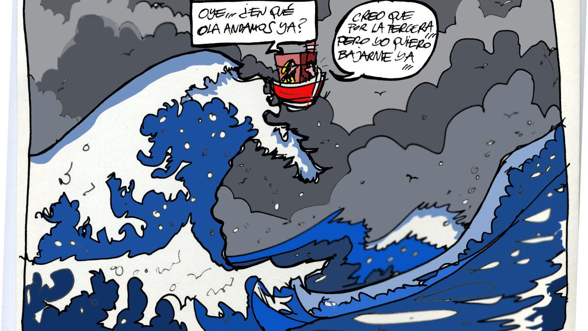 Tal y como refleja la viñeta gráfica, se trata de una conversación entre dos pasajeros de un barco en la que uno pregunta: "Oye, ¿en qué ola andamos ya?, y el otro contesta: "Creo que por la tercera ola pero yo quiero bajarme ya".