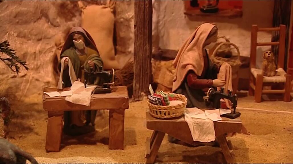 Además podremos ver a la Virgen tejiendo, sin descanso, mascarillas. El ángel distanciado porque no es de la unidad familiar.