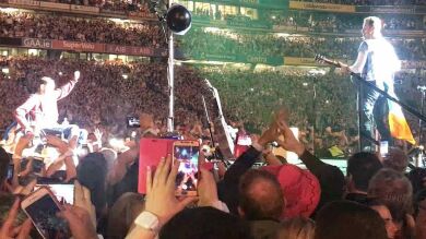 Un joven en silla de ruedas irlandés ha acabado tocando con el guitarrista de Coldplaydespués de que un espectador se cayera encima suya y le compensara aupándole con su grupo de amigos para que pudiera ver el concierto mejor.