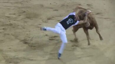 En un momento dado, el joven vuelve a ponerse de rodillas, esperando la acometida de la bestia. Sin embargo, en esta ocasión, la bestia no cae en el amago y carga contra el recortador, que se llevó una cornada en el muslo, provocando que diese una vuelta completa en el aire.