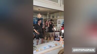 La cara y las palabras del cantante de Cash Caravan describen ese inesperado momento: "Hostia p...", dice al comprobar quién sube al escenario. La banda se sumó rápidamente al reto de tocar para los mismísimos Estopa y los clientes gritaron 'sin freno' y vivieron una actuación en directo improvisada.