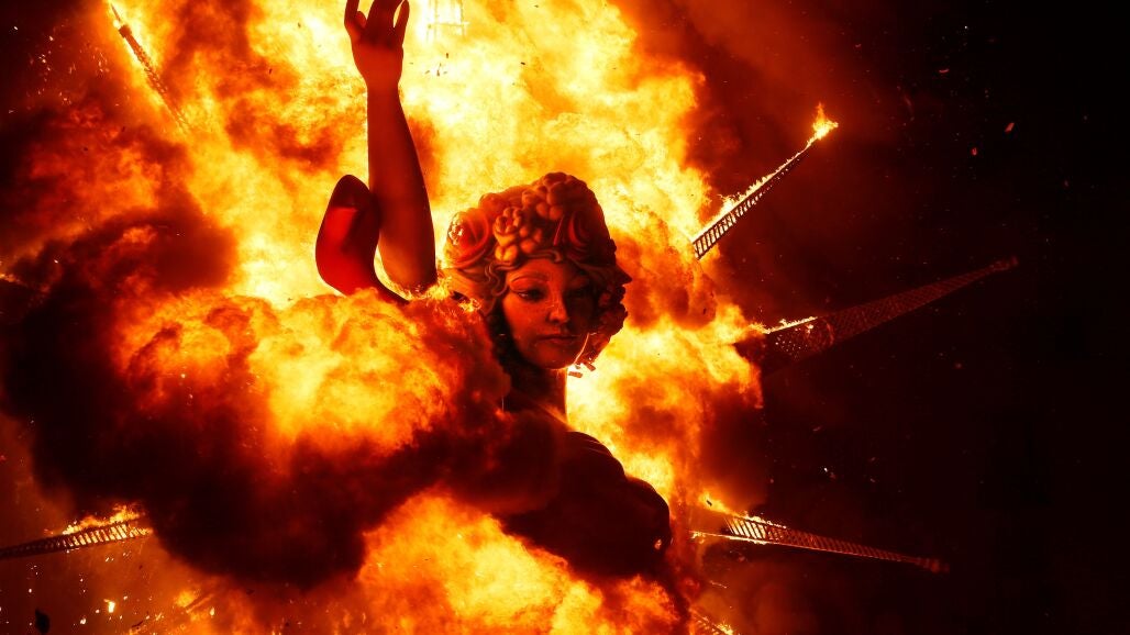 El ritual de fuego y agua que desde hace 91 años da paso al verano se ha celebrado con la quema de los 180 monumentos plantados por toda la ciudad.