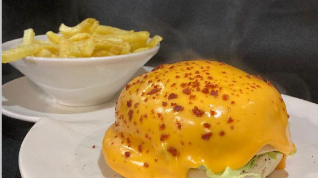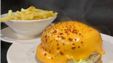 Hamburguesa volcán de queso: se come con guantes porque el queso está por fuera