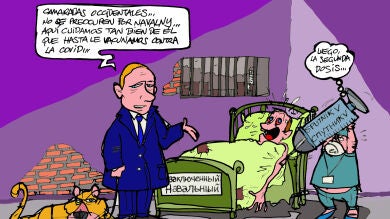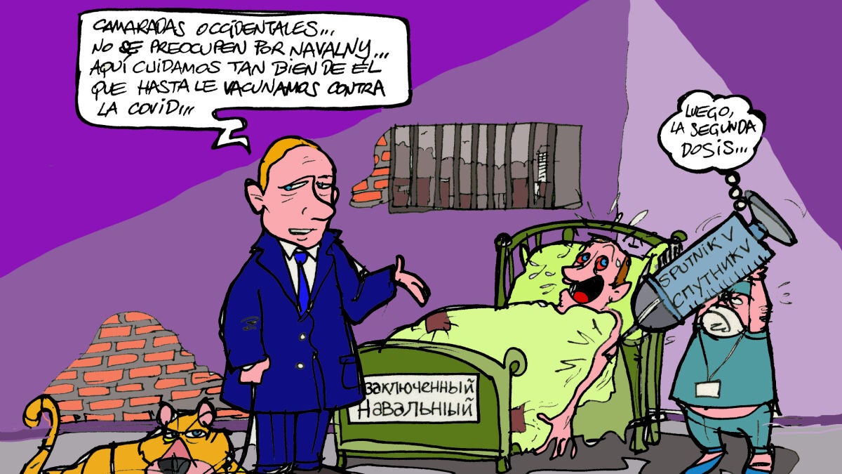 La inquietud por la salud del líder opositor ha protagonizado la viñeta gráfica de la semana de nuestro ilustrador, Alfredo Boto-Hervás, que lo refleja con un Vladimir Putin 'animado' que asegura: "Camaradas occidentales... No se preocupen por Navalny... Aquí cuidamos tan bien de él que hasta le vacunamos contra la COVID-19".