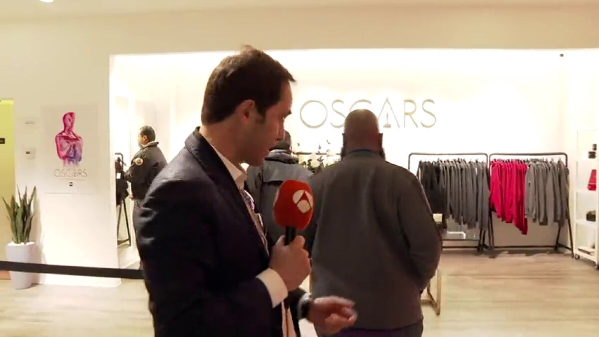 Se está a punto de descubrir la alfombra roja a la puerta del Teatro Dolby, hay mucha gente de paso y turistas, pero todavía queda alguno despistado que confiesa no saber la fecha de celebración de la gala. La reacción de Abad es la que cualquiera hubiéramos tenido ante esas palabras. Además, como todos quisiéramos, el corresponsal consigue entrar en la tienda de los Oscar para mostrársela a los telespectadores, al menos durante los pocos segundos que está en su interior hasta ser expulsado por la seguridad del establecimiento.