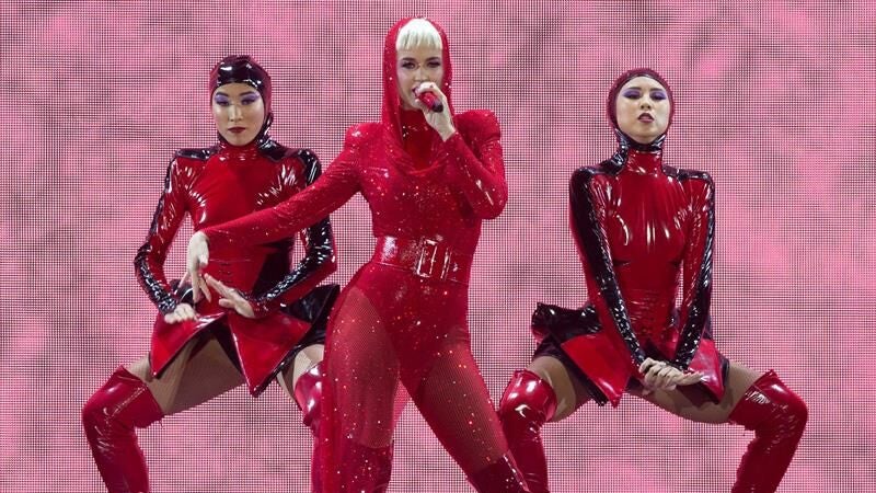 En "E.T." ha subido al escenario un bailarín en zancos, vestido como un insecto alienígena y en "Bon Appétit", la artista se ha estirado sobre una hoja verde mientras los bailarines vertían sobre ella lentejuelas salidas de enormes frascos de sal y pimienta.