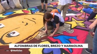 Alfombras de flores, brezo y marmolina cubren las calles de La Laguna, en Tenerife, para la celebración del Corpus Christi, una fiesta con más de 100 años de historia.