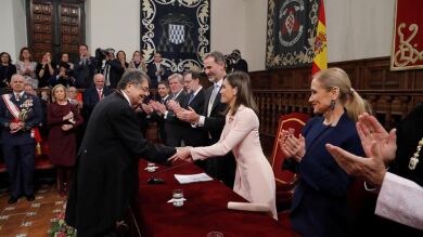 Rajoy y Cifuentes no coincidían en público desde que tuvo lugar la convención del PP en Sevilla los pasados 6 y 7 de abril, días después de que la presidenta madrileña se viera envuelta en la polémica sobre su máster universitario. Junto a otras autoridades, Rajoy y Cifuentes han recibido a los Reyes a su llegada al Paraninfo de la Universidad de Alcalá de Henares (Madrid).