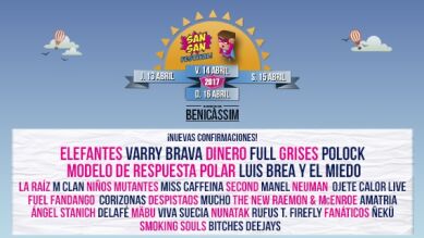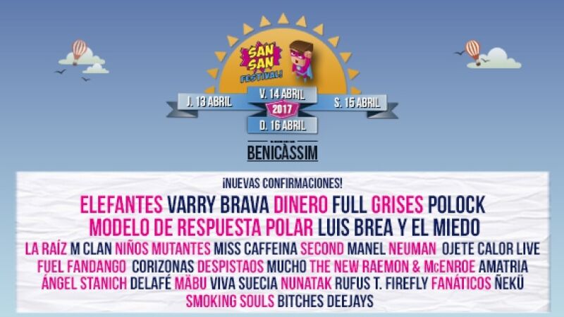 Elefantes, Varry Brava, Dinero, Full, Grises, Polock, Modelo de Respuesta Polar y Luis Brea y El Miedo son las ocho nuevas confirmaciones del SanSan Festival, que se celebrará del 13 al 16 de abril en Benicàssim (Castellón), coincidiendo con las vacaciones de Semana Santa.