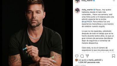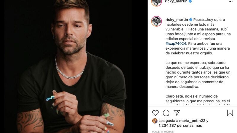 Esta intransigencia se sigue viviendo cada día y lo ha sufrido en sus carnes el cantante Ricky Martin, quien ha mandado un mensaje de apoyo y reflexión a la sociedad y sobre todo al colectivo. El artista ha querido compartir un mensaje en su red de Instagram en el que comienza con "pausa...hoy quiero hablarles desde mi lado más vulnerable... Hace una semana, subí unas fotos junto a mi esposo para una edición especial de la revista @cap74024. Para ambos fue una experiencia maravillosa y una manera de celebrar nuestro orgullo".