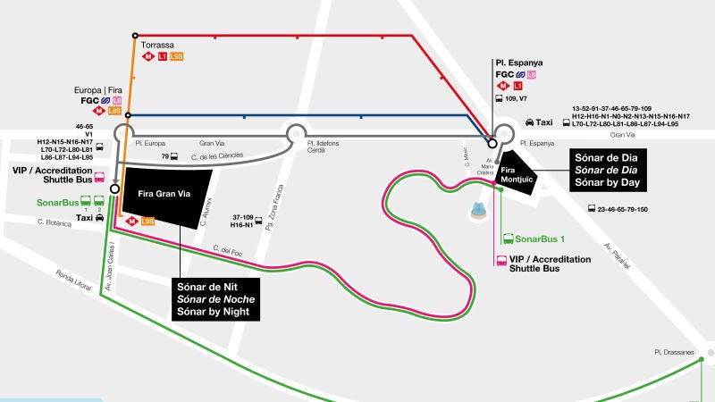 Este festival cuenta con dos festivales dentro de cada uno, por un lado el Sónar de día y por otro el Sónar de noche. El Sónar de día se celebra en Fira Montjuïc y el de noche en la Fira Gran Vía. Para ir de un festival al otro se puede ir en autobús, metro o con los autobuses que pone el festival.