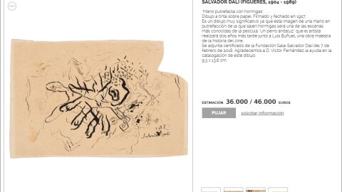 También venderán 'Mano con hormigas' (tinta sobre papel, 1927), un boceto preparativo de la película 'Un perro andaluz', y 'Personaje sentado en un café' (tinta sobre papel, 1926), realizada en un solo trazo y con ecos cubistas de Pablo Picasso.
