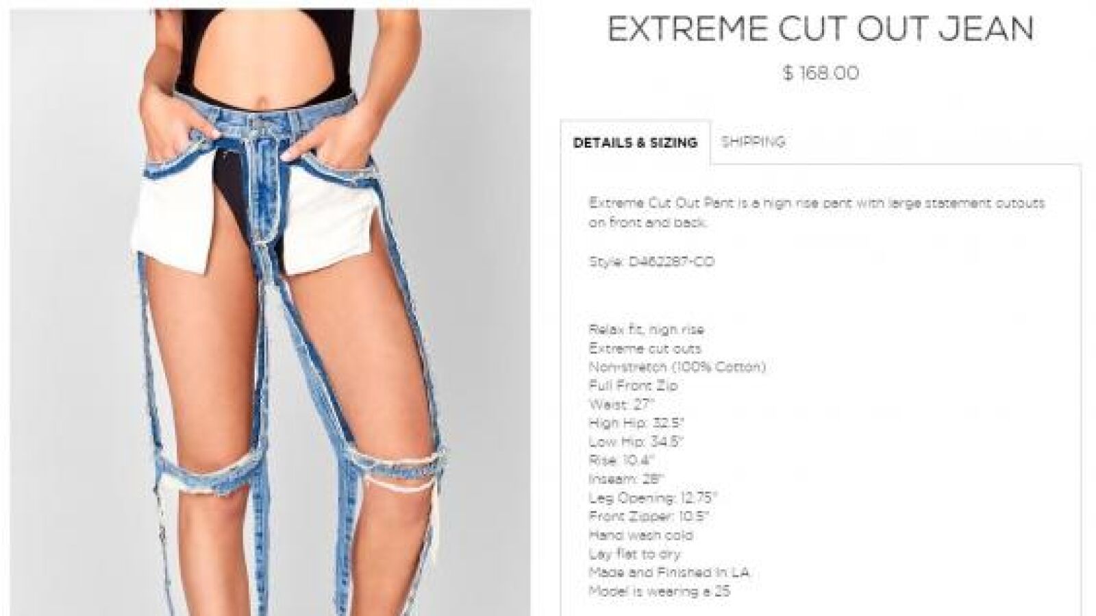 Como se aprecia en las imágenes del producto en la web de la marca de tejanos, estos vaqueros están rasgados por delante y por detrás, dejando solo los bolsillos, un mínimo de tela en las rodillas y las costuras; en definitiva, lo básico para que la prenda se sujete y no se desmonte. La ausencia de tela parece ir en proporción inversa a su precio, ya que Carmar vende estos pantalones por 168 dólares, unos 150 euros.