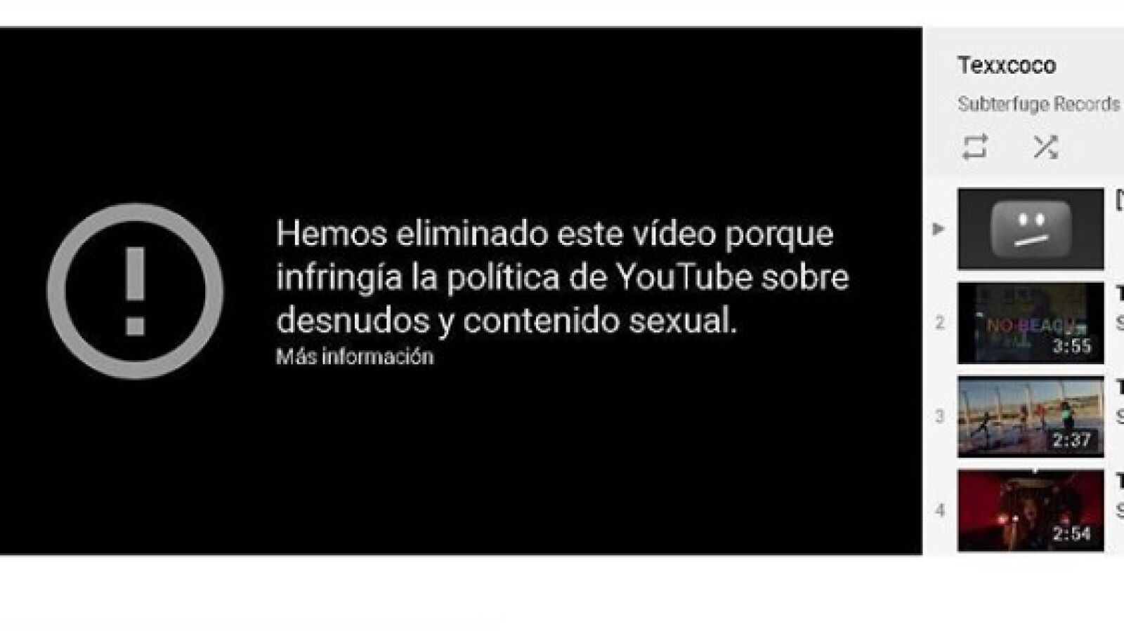 La cantante del grupo Texxcoco denuncia que YouTube ha censurado un videoclip de la banda en el que aparece ella con el torso desnudo por infringir "la política sobre desnudos y contenido sexual". Precisamente este vídeo tenía el objetivo de luchar contra el puritanismo de las redes sociales y reivindicar la libertad de las mujeres para mostrar su cuerpo, según denuncia la cantante y letrista.