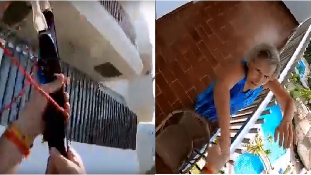 Un saltador base impacta contra contra una pared del edificio y queda suspendido en el aire durante más de un minuto: una mujer intenta ayudarle para que entre a su balcón y salve la vida. Ha sucedido en Acapulco, México.