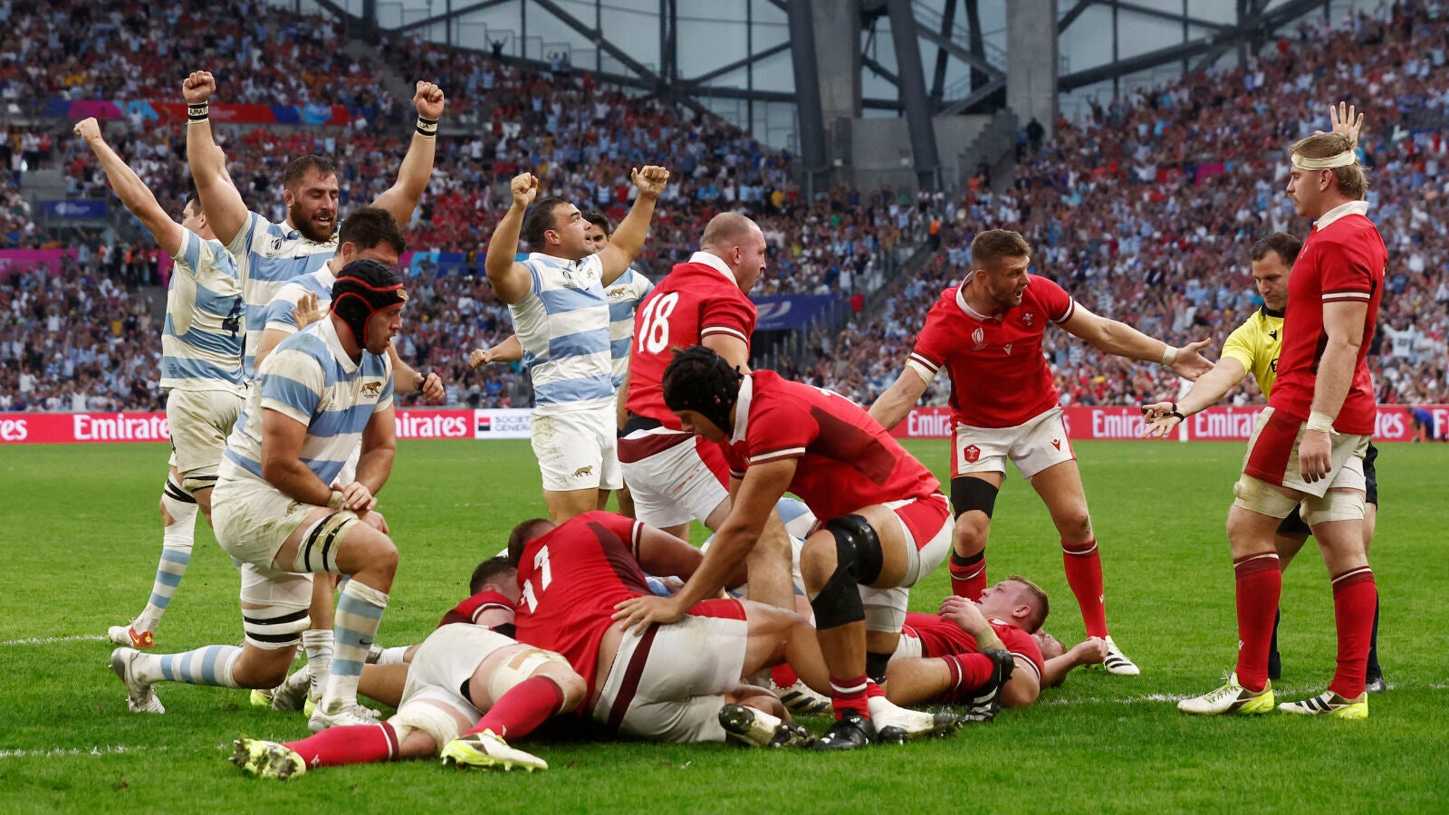 El ensayo de Tomos Williams (17-12, m.58) fue el epílogo del XV galés. A partir de ahí solo hubo un equipo sobre el césped del Velódromo de Marsella. Argentina empujó a Gales hasta su veintidos y allí encontró el camino a la victoria y las semifinales. Joel Sclavi devolvió las tablas al choque con un ensayo y Boffeli el mando con la conversión (17-19, m.69).
