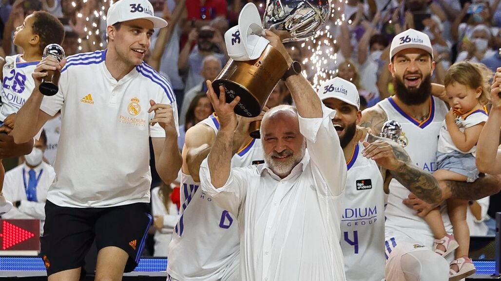 Pablo Laso no quiso perderse el partido en el WiZink Center, aunque lo hizo como un aficionado más y no en el banquillo. Tras ganar el título, el capitán Sergio Llull tuvo un emotivo detalle con el técnico: se lo dio a su entrenador el trofeo de la 36ª liga ACB blanca para que lo levantara tras tumbar al Barcelona.