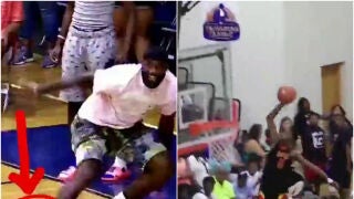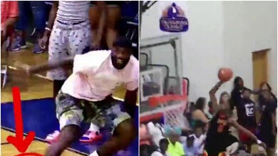 Un chico firma un mate increíble y entonces vemos cómo uno de los padres salta a la cancha y pierde una zapatilla con su histriónica celebración... ¡es el mismísimo LeBron James!