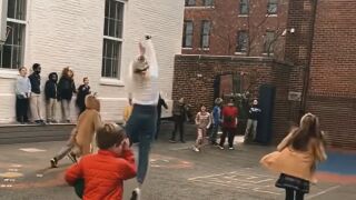 Una maestra anota la canasta imposible y desata la locura de los niños en el patio de un colegio