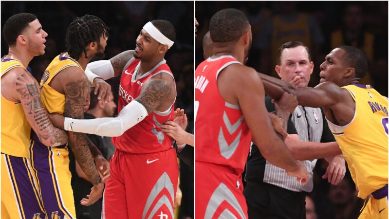 Era el partido estrella de la jornada en la NBA y acabó en pelea. Los jugadores de los Lakers y los Rockets tuvieron una trifulca empezada, presuntamente, por un escupitajo de Rondo a Paul, que el base de los Rockets respondió metiéndole los dedos en los ojos.